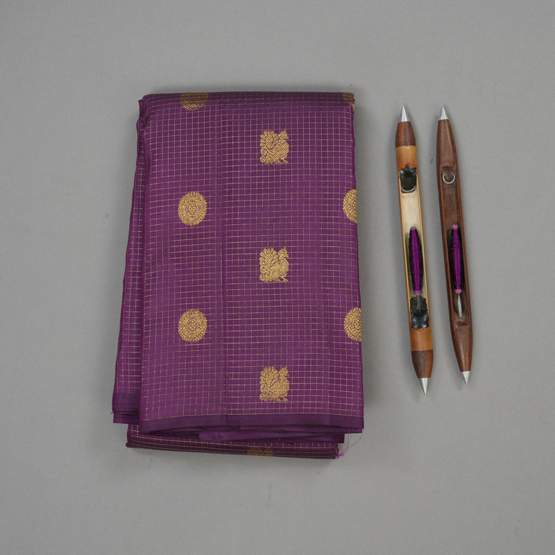 Embrace the seamless grandeur of this deep Handloom Deep Violet Kanjivaram Silk Saree. This magnificent Borderless Vintage Kanjivaram features intricate Jari Checks woven across the body, with auspicious mayil (peacock) and chakram motifs woven within the checks. The all-over texture and motif work create a sophisticated and densely patterned drape.