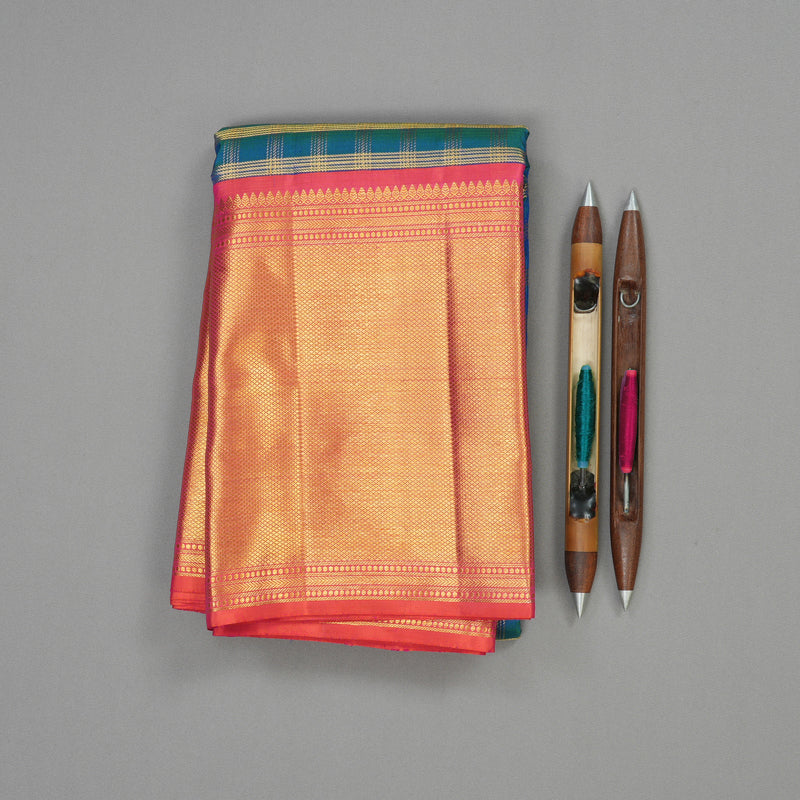 Step into the luxurious drape of this Mayilkazhuthu Vintage Kanjivaram Silk Saree, framed by a charming Rose Pink Border. The entire body shimmers with all-over Jari Checks, and the high-impact big zari pet border completes the regal look.