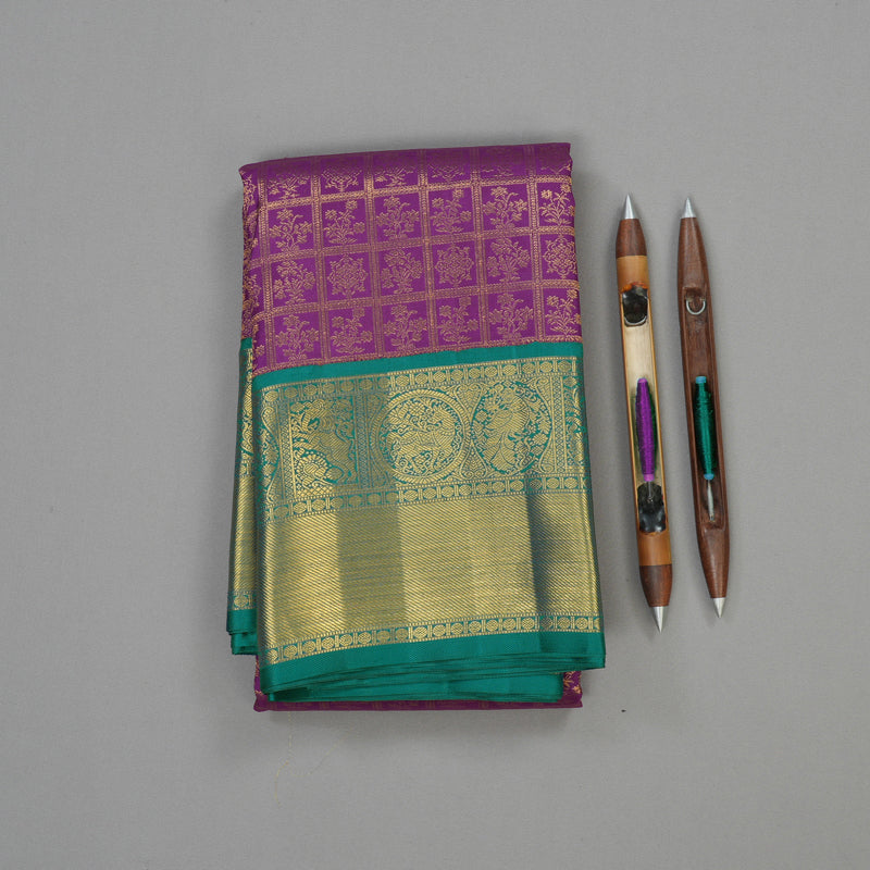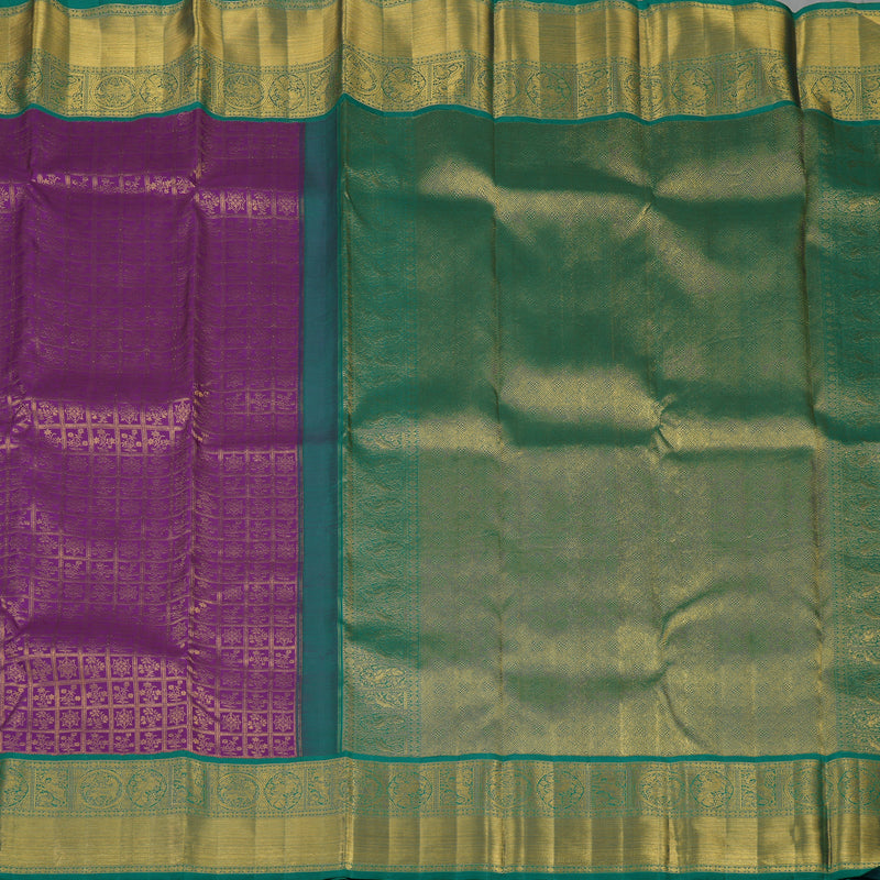 Step into a realm of majestic beauty with this high-end Handloom Kanjivaram Silk Saree, a masterpiece of weaving in a regal shade of Purple. The body is intricately detailed with shimmering jari checks, with each intersection graced by a delicate floral butta, creating a tapestry of timeless elegance. Utilizing the legendary Korvai technique, the saree features a striking contrast border in Peacock Green, which is richly adorned with mythical Yazli and Horse motifs.