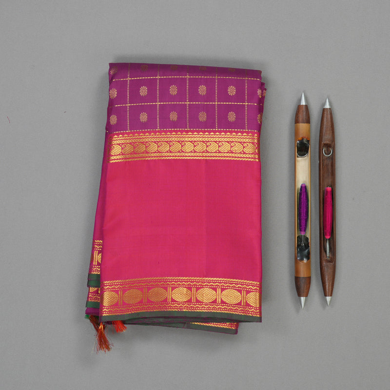 A vibrant, regal contrast defines this stunning Purple Vintage Kanjivaram Silk Saree, framed by a cheerful Rani Pink Border. This pure silk heirloom features a Rettapet border woven with auspicious paisley and rudrasksha motifs. The body has rich Jari Kattam (checks) all over with small floral buttas.