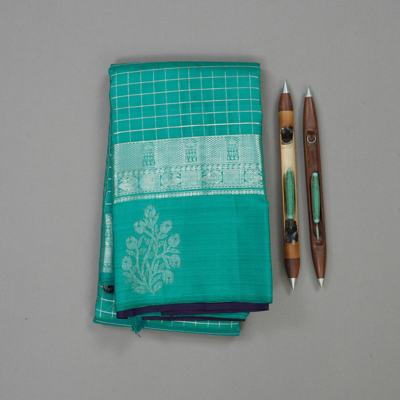 A rich texture distinguishes this beautiful Sea Green Vintage Kanjivaram Silk Saree. This traditional silk features all-over Jari Checks on the body, with the border intricately woven with traditional anna pakshi and rudraksham elements, creating a symbolic and opulent drape. This is a prized pure silk heirloom piece.