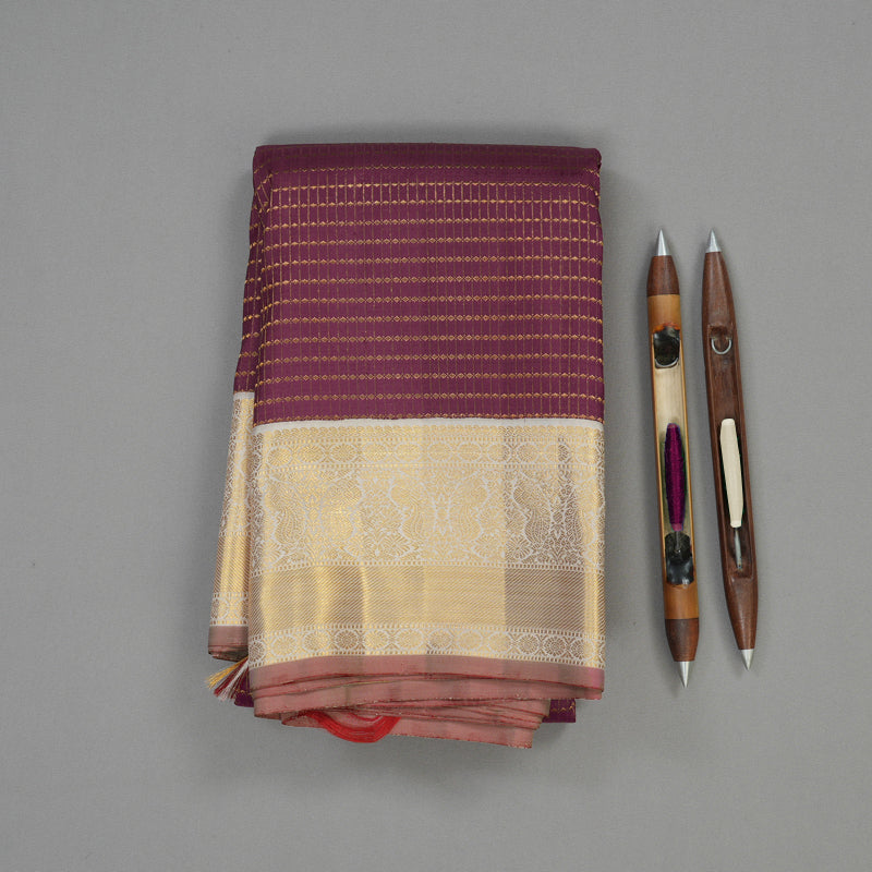Discover the elegance of this Violet Kanjivaram silk saree, featuring a Half White contrast and stylish jari checks on the body. The striking border showcases the majestic Mayil (peacock) motif, while the grand pallu adds a touch of sophistication.