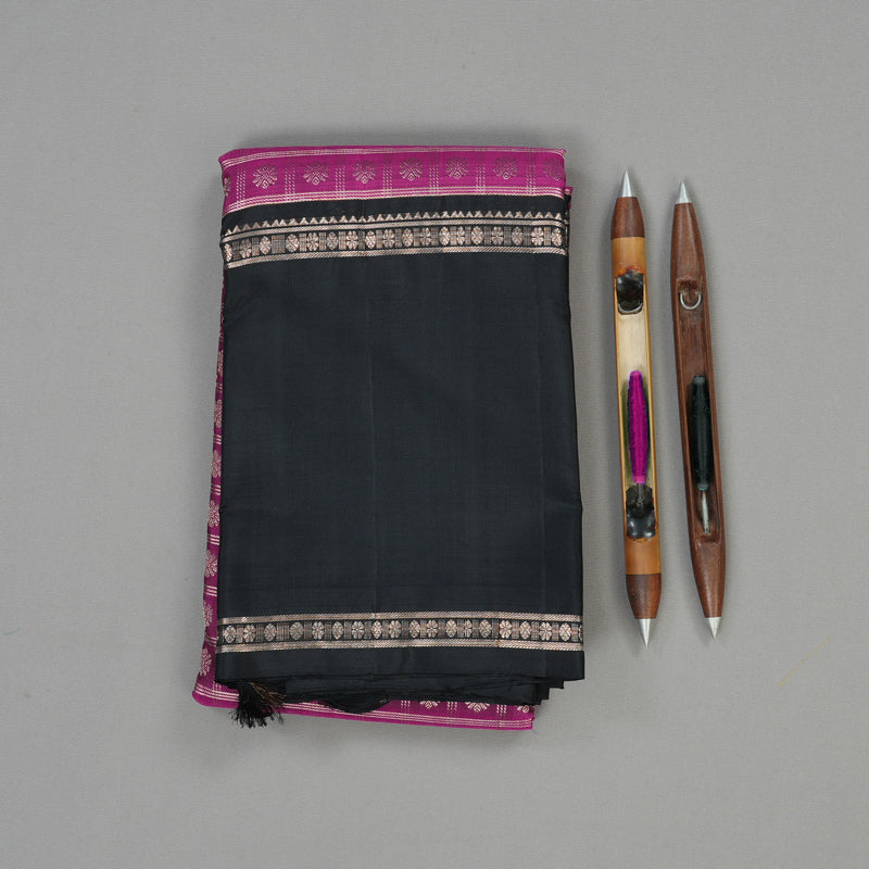 Discover a masterpiece of traditional weaving with this Vintage Wine Purple Kanjivaram Silk Saree. The body is a canvas of sophistication, featuring delicate jari checks interlaced with charming floral buttas. The design is elegantly framed by a contrasting black Rettapet border, which is subtly woven with complementary small traditional motifs, creating a truly unique and arresting colour combination.
