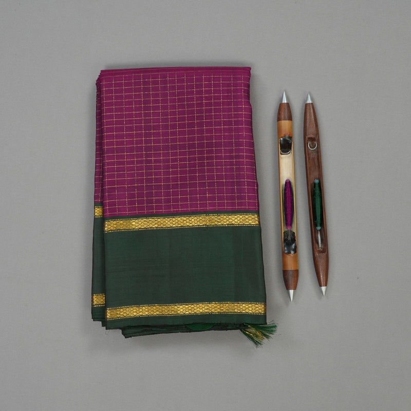 A deep, commanding contrast defines this Wine Purple Vintage Kanjivaram Silk Saree, framed by a rich Karum Pachai (Dark Green) Border. This traditional silk features all-over Jari Checks on the body and a Rettapet border woven with subtle small buttas, offering a classic, luxurious texture. It is a perfect pure silk heirloom piece.