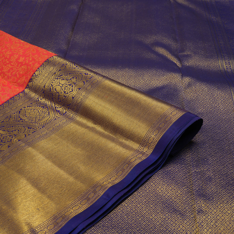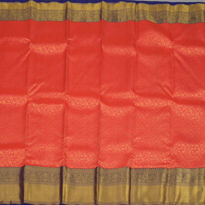 The pallu is richly woven in a contrasting purplish blue, adding depth and sophistication to the overall look. The entire body of the saree is adorned with intricate brocade floral patterns, showcasing a seamless blend of classic beauty and expert craftsmanship.