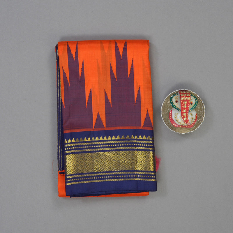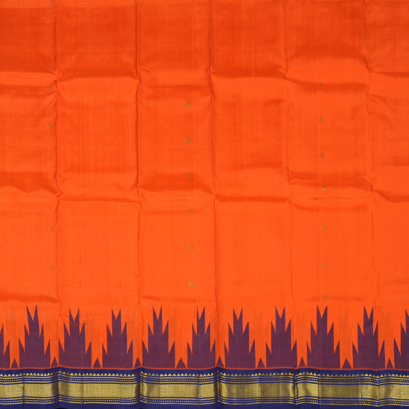 This vibrant, fanta orange Pure One-sided border Kanjivaram Silk saree features a glowing body that radiates energy. It is beautifully framed by a navy blue temple border and pallu, where the traditional motifs create a striking and regal contrast against the bright orange silk.
