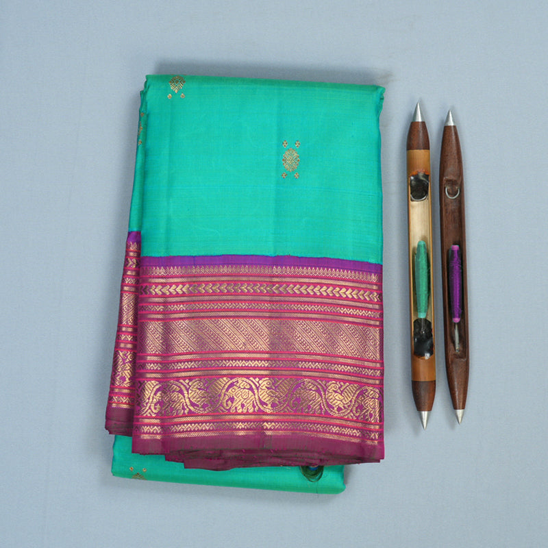 This Handloom Kai-korvai kanjivaram features a refreshing aqua green body meticulously adorned with delicate butta motifs. Masterfully woven from premium silk, it offers a luminous and majestic look.