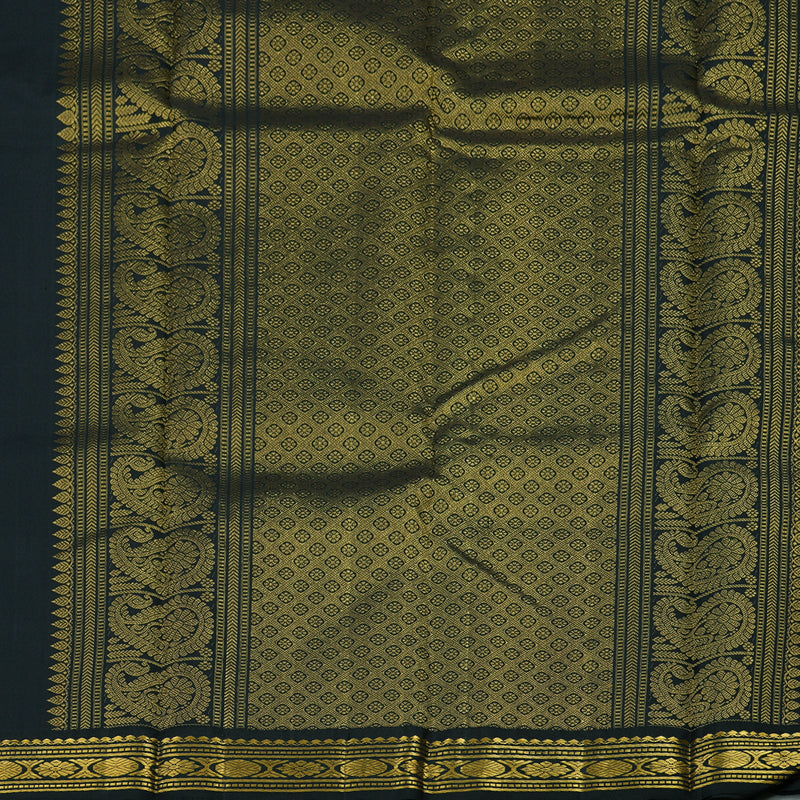 This rich body is framed by a sophisticated black border, designed to be a small border that adds a sharp, defining contrast without overpowering the body's colour and pattern. This traditional yet strikingly elegant Kanjivaram silk saree is available for ₹14,620.