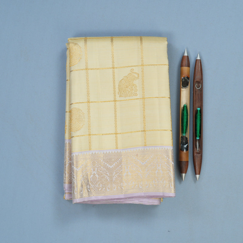 This Handloom Bridal Kanjivaram features a serene beige body enriched with jari checks, elephant, and chakaram motifs. Paired with a rich-woven border, it creates a majestic, high-status silhouette that radiates a timeless heritage grace.