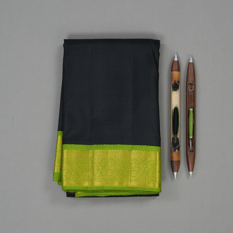 Make a bold statement in this striking black Handloom Kanjivaram silk saree, masterfully crafted using the traditional korvai contrast technique. The deep black body is framed by an elegant border meticulously adorned with paisley motifs, lending a classic and feminine grace to the structured weave.
