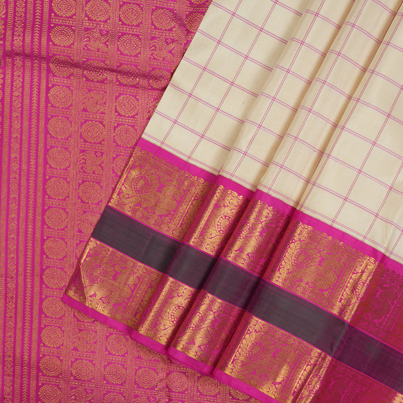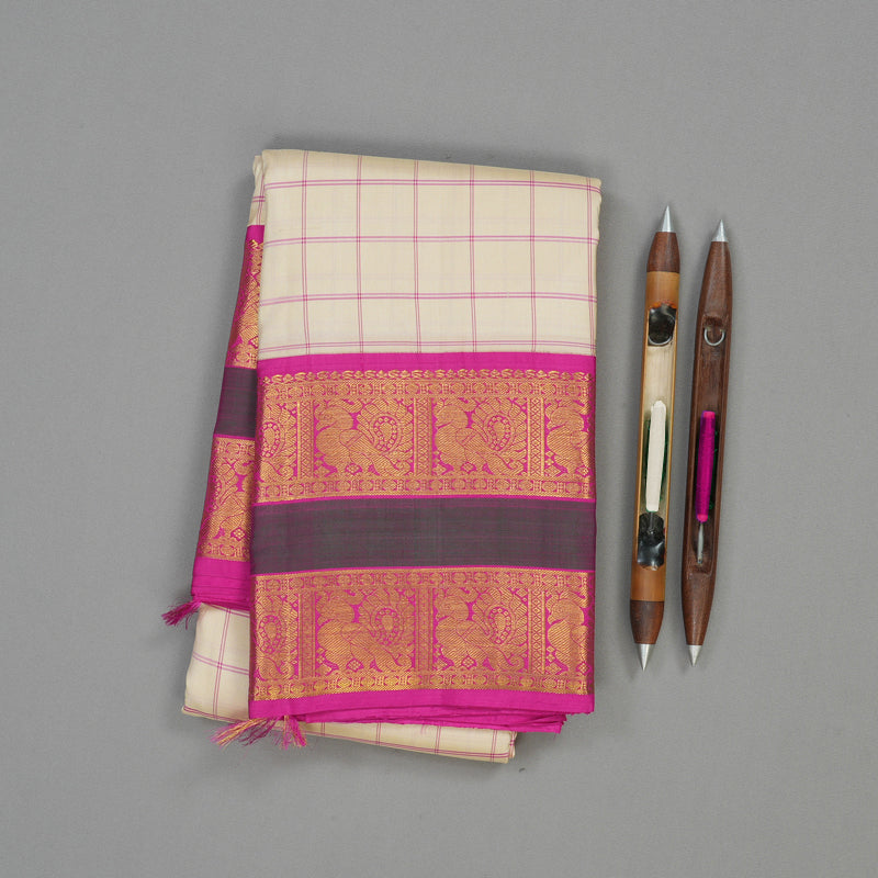 A classic, striking contrast defines this elegant Cream Vintage Kanjivaram Silk Saree, framed by a deep Magenta Border. This pure silk heirloom features Thread Checks across the body and a Rettapet (double border) woven with traditional Annapakshi motifs.