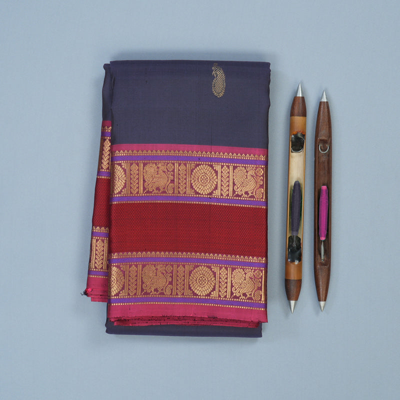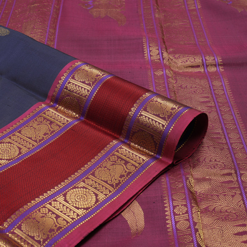 A distinguished handloom vintage Kanjivaram silk saree in dark bluish-grey, adorned with graceful paisley motifs that whisper of timeless elegance. The rettapet border features intricate thread meenkarai work that showcases exceptional artisanal precision. The pink pallu and blouse radiate warmth through luxurious weaving.
