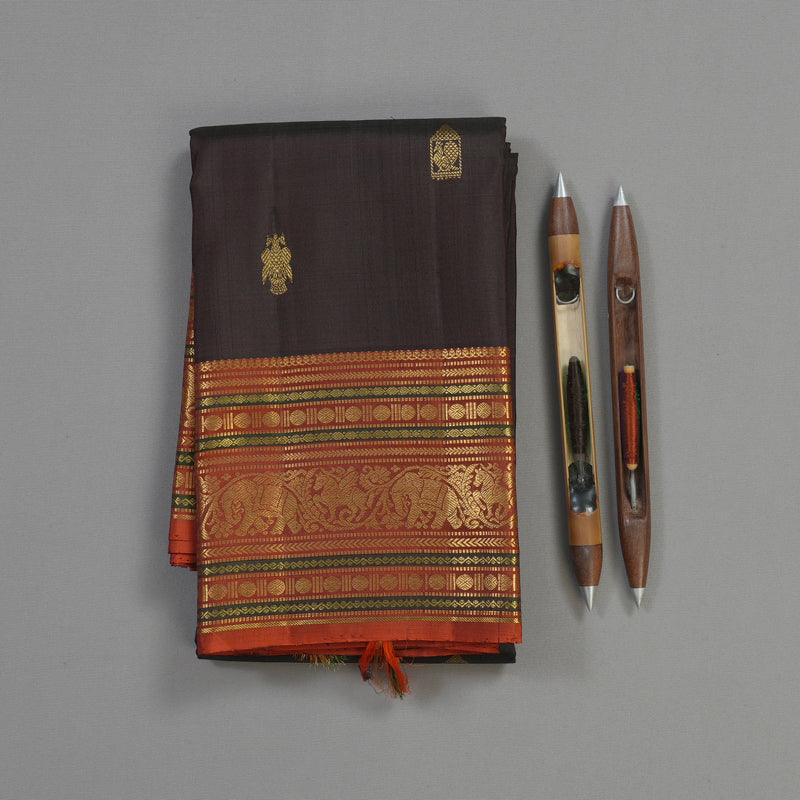 Experience the elegance of this handwoven silk saree, featuring a rich deep brown body adorned with striking iruthalaipakshi and annam motifs. The vibrant rust orange border, pallu, and blouse perfectly complement the design.