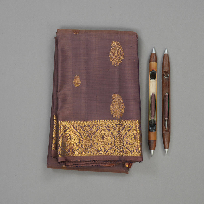 A deep, tonal look defines this elegant Dual tone (Brown & Purple) Vintage Kanjivaram Silk Saree, framed by a matching Dual tone (Brown & Purple). This pure silk heirloom features paisley motifs on the body and floral motifs on the border.