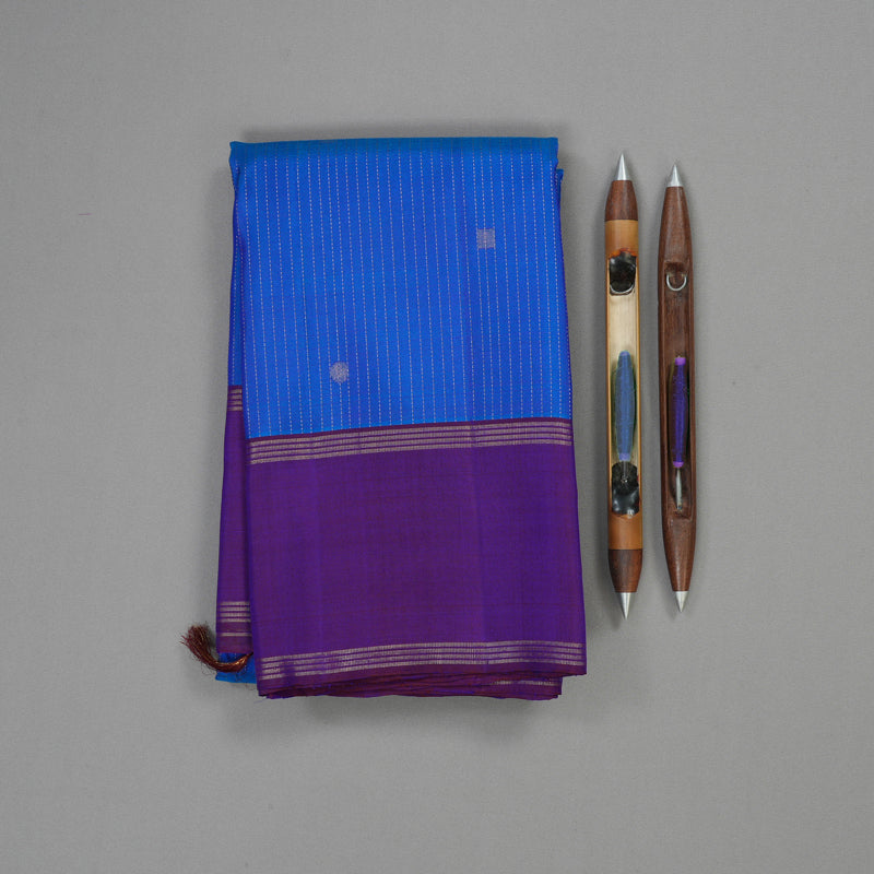 A deep, harmonious look defines this elegant Ink Blue Vintage Kanjivaram Silk Saree, framed by a rich Purple Border. This pure silk heirloom features zari stripes on the body with small floral buttas.