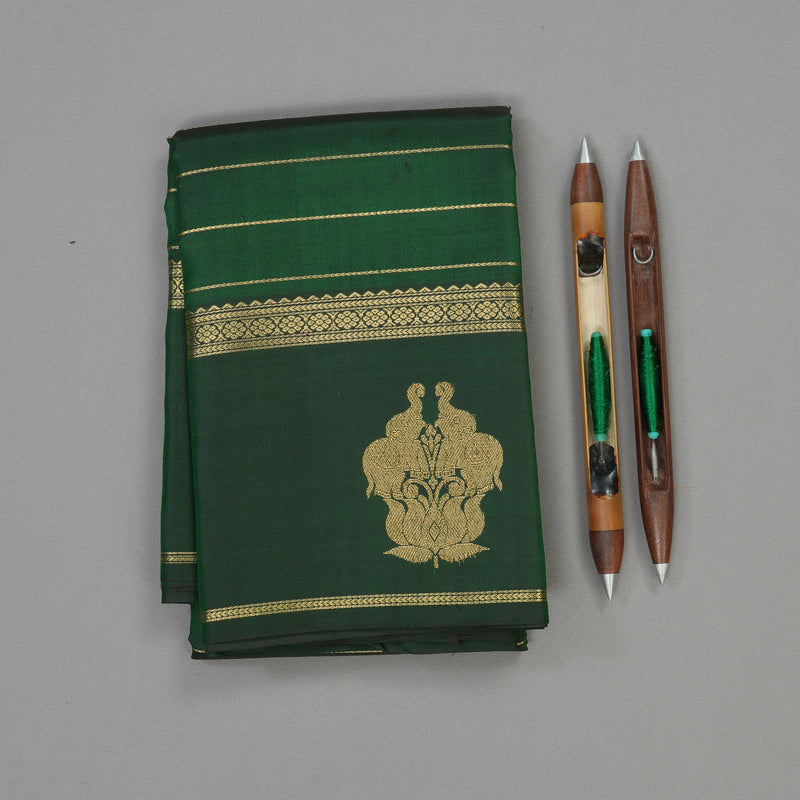 Experience the timeless allure of this elegant Handloom Kanjivaram Silk Saree, presented in the captivating hue of Vintage Karpaga Pachai (a traditional, serene green shade). The body is beautifully textured with shimmering veldhari jari lines, which run vertically across the fabric, lending a fine, luminous stripe effect that adds depth and sophistication.