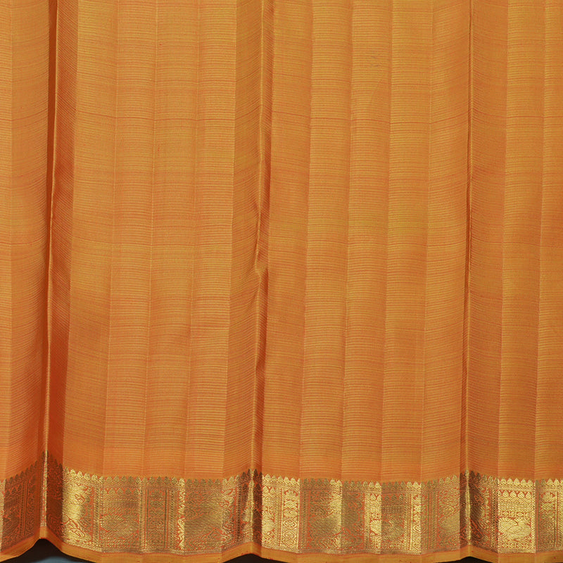 A resplendent handloom bridal Kanjivaram silk saree in manthulir, adorned with vairaoosi lines, delicate thread work, and chakaram motifs. The grand woven border showcases yazli, temple, and multiple traditional designs with ceremonial splendour. The golden orange pallu and blouse radiate warmth through meticulous weaving.