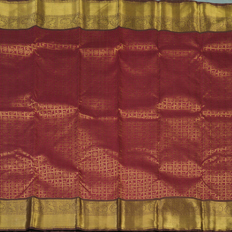 Presenting a true masterweave from the Hayagrivas Silk House collection—a majestic maroon body intricately detailed with shimmering jari checks and delicate floral motifs. This bridal Kanjivaram silk saree is anchored by a traditional gettipet border, densely adorned with mythical yazli, horse, and rudraksham elements that signify strength and divinity.