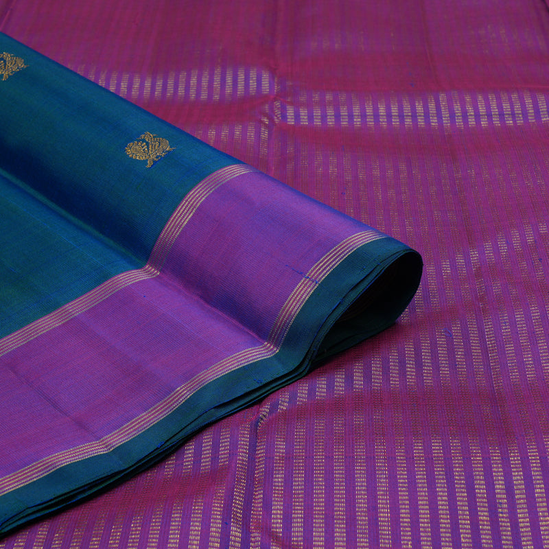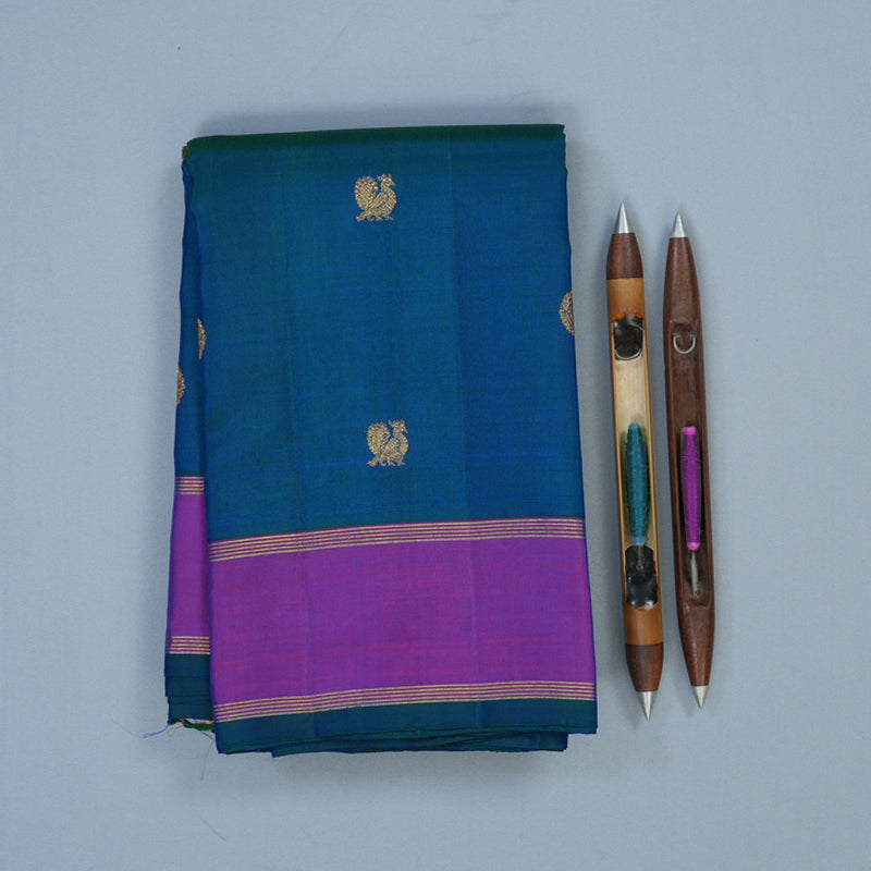 This Handloom Kanjivaram features a stunning mayilkazhuthu body, woven with traditional annam and chakaram motifs. Masterfully crafted from premium silk, it offers a majestic and iridescent drape that blends sacred symbolism with a rich, dual-toned lustre.