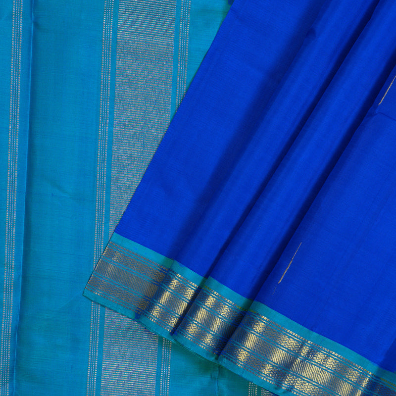 A deep, classic contrast defines this elegant MS Blue Vintage Kanjivaram Silk Saree, framed by a ananda blue Border. This pure silk heirloom features subtle raindrops buttas on the body.