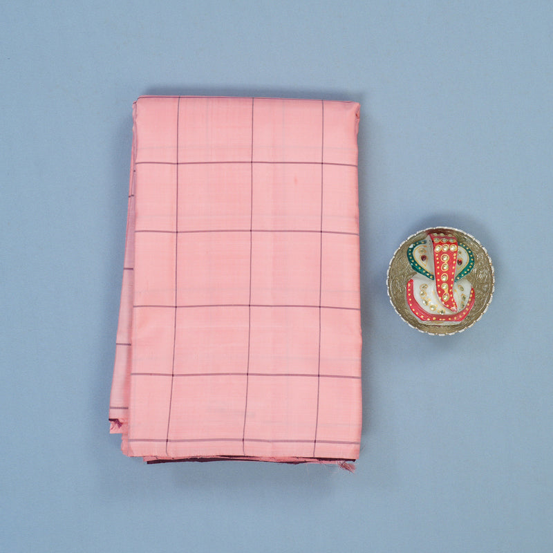 This Lightweight Kanjivaram features a delicate peach pink body adorned with subtle thread checks. Designed as a modern borderless silhouette, this saree emphasizes a clean and fluid grace that highlights the intricate body weave.