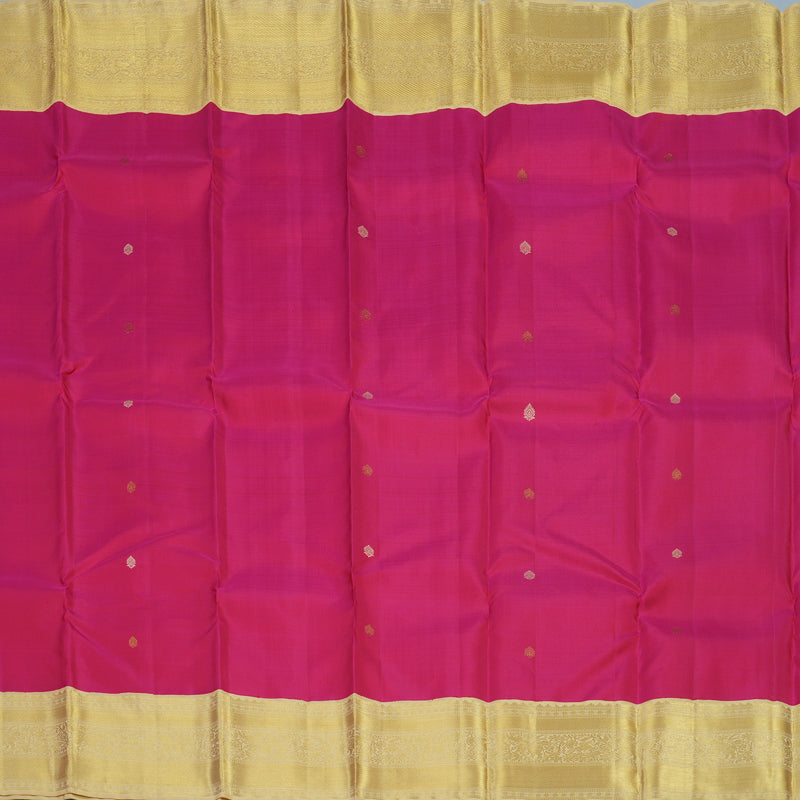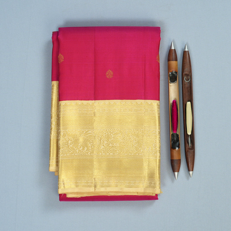 This Handloom Kanjivaram features a vibrant pink body meticulously adorned with a delicate blend of thread and jari butta. Masterfully crafted from premium silk, it offers a luminous and textured drape that balances traditional shimmer with sophisticated, artisanal detailing.