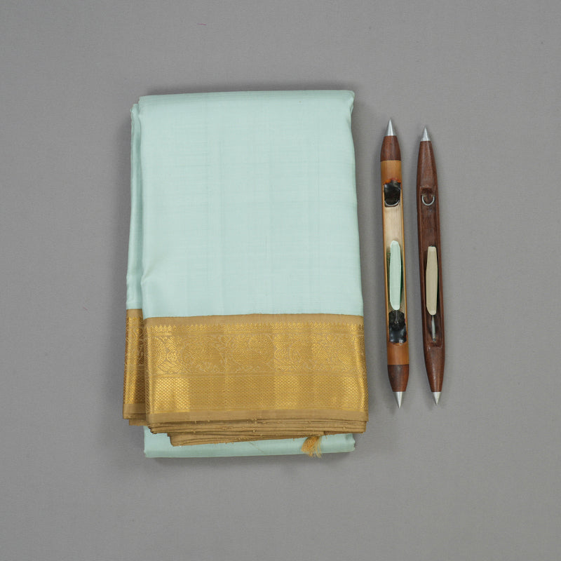 A serene and classic Powder Blue Korvai Contrast Kanjivaram Silk Saree that achieves a gentle contrast with its warm Golden Beige Border. This pure silk garment is ideal for a graceful, understated presentation.