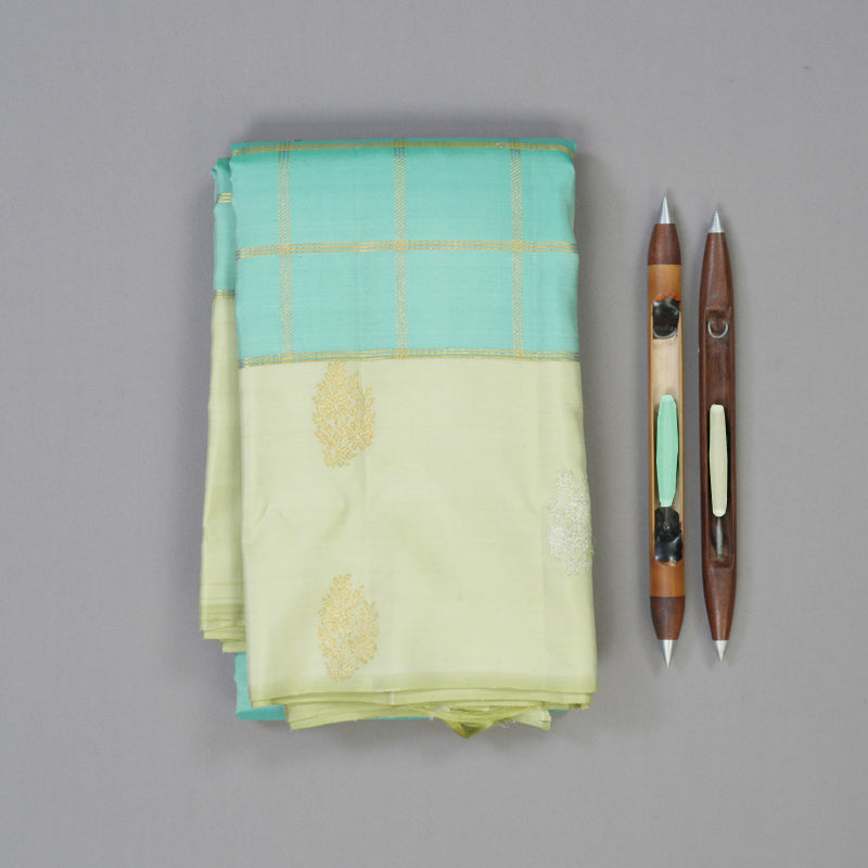 This serene Handloom Kanjivaram Silk saree features a refreshing powder blue body detailed with classic jari checks, offering a subtle yet luminous texture. The drape is distinguished by a traditional karai butta border featuring intricate floral motifs, blending nature-inspired artistry.
