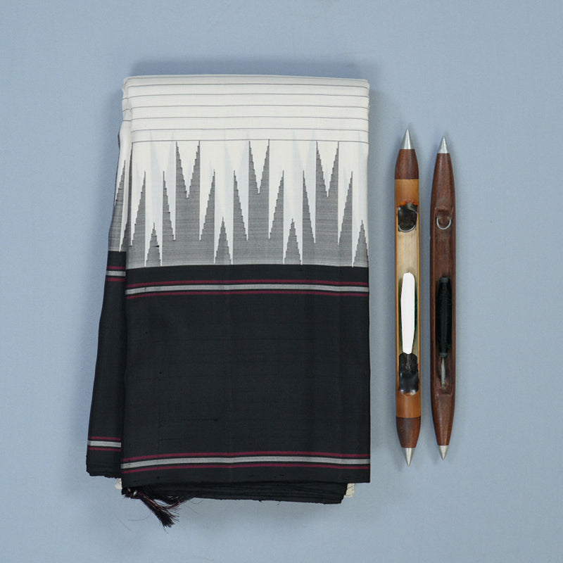 The saree is defined by a striking black bodi karai border accentuated by a traditional temple design, completed with a matching black pallu and blouse. This high-contrast masterpiece is perfect for office formals and casual occasions, offering a sophisticated aesthetic priced at Rs. 15,730.