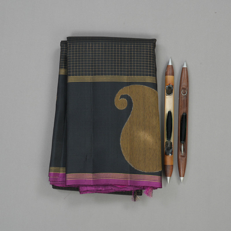 If you love striking combinations, this Kanjivaram silk saree is for you. With a deep black body, this saree features fine golden jari checks running all over, bringing structure and richness to the fabric. The highlight is the grand gold zari paisley buttas spaced beautifully along the lower half of the drape, large, bold, and impactful.