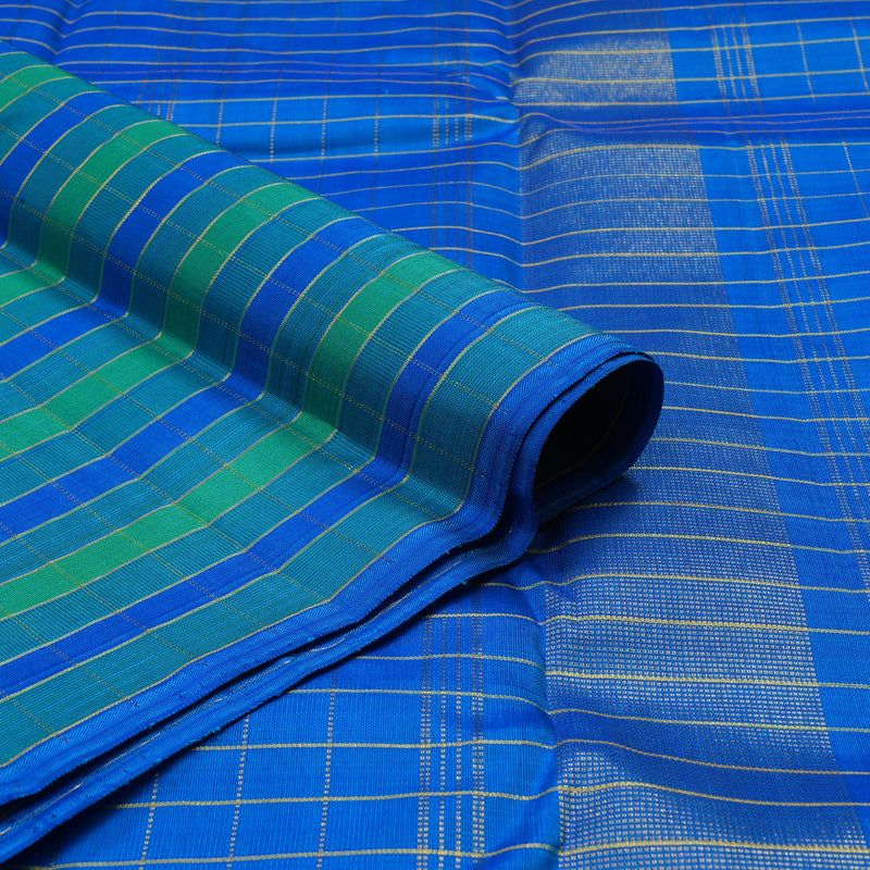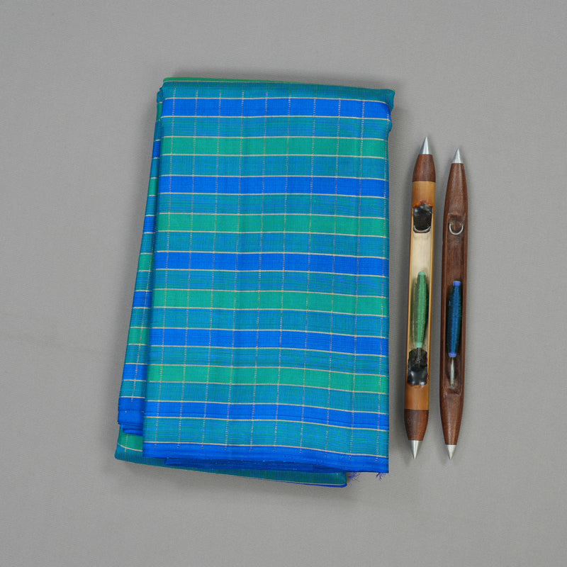 This Hayagrivas Handloom Kanjivaram Silk saree is all about delicate Self contrast and intricate beauty. The refreshing Blue checked body of this Kanjivaram saree is adorned with classic golden zari buttas, spaced across the soft silk fabric like scattered blossoms. What makes it truly special is the Sea Blue korvai contrast border and pallu, bringing in an elegant vibrancy to the overall look.