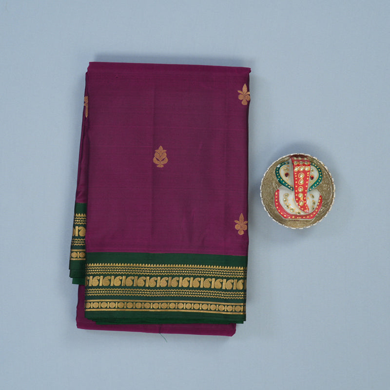 A graceful, lightweight Kanjivaram silk saree in rich purple with a delicate varisapet contrast border. The bottle green pallu and blouse create a striking colour harmony through traditional weaving.