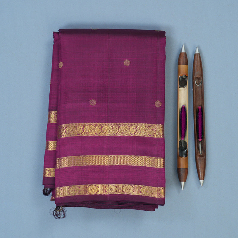 This Handloom Kanjivaram features a regal purple body elegantly accented with shimmering buttas. The saree is defined by a classic varisapet border, adding a rhythmic and structured architectural frame to the design.
