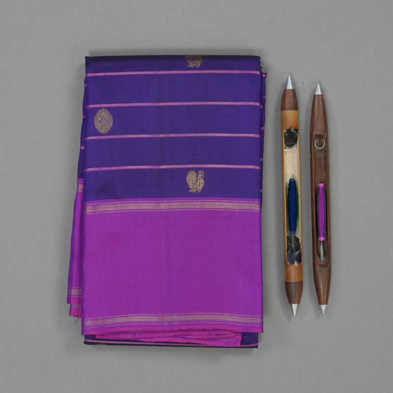 This Handloom Kanjivaram features a regal royal blue body meticulously detailed with shimmering veldhari lines and traditional annam chakaram motifs. The interplay of these auspicious symbols against the deep blue silk creates a look of timeless sophistication and artisanal depth.