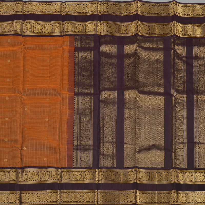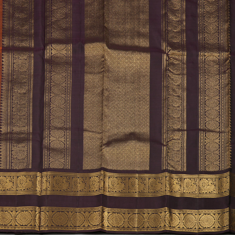A harmonious, rich look defines this beautiful Rust Orange Bridal Vintage Kanjivaram Silk Saree, framed by a tonal deep Plum purple Border. This premium bridal silk features elegant Jari Kattam (Zari Checks) with annam & chakaram motifs on all over the body, and the border showcases the auspicious peacock in a chakram motif. This is an ideal pure silk saree for traditional ceremonies.