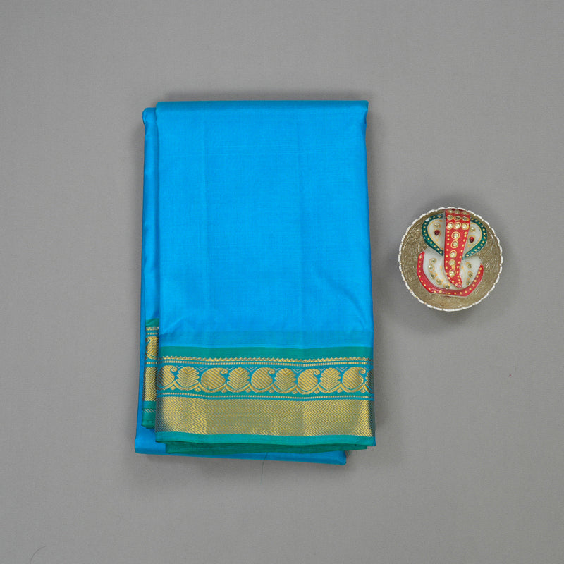 Step into the refreshing contrast of this Lightweight Kanjivaram in cool Sky Blue and a lively Rama Green border. This comfortable silk is elegantly finished with a zari pet border featuring delicate paisley motifs, adding a classic touch to the vibrant colour pairing.