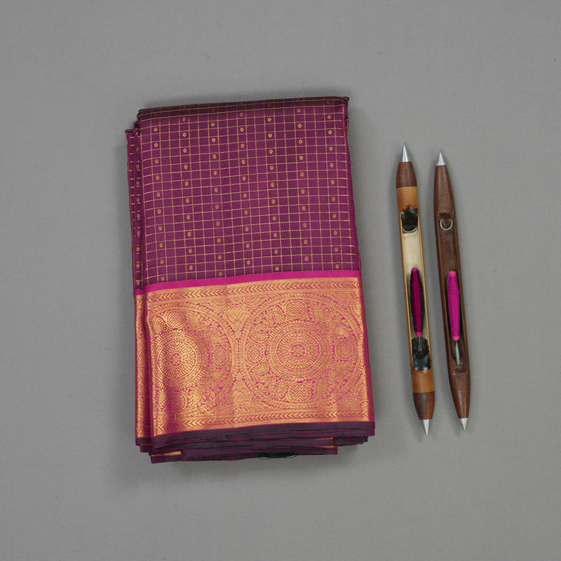 The body features intricate Jari Kattam (checks) all over, adding textural elegance, while the border is dominated by a big chakram with buttas. This saree is a compelling choice for collectors of traditional vintage silks. Priced at ₹23,650
