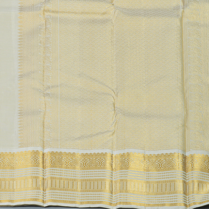 This Handloom Kanjivaram features a luminous yellow body adorned with traditional vairaoosi lines and delicate butta, offering a radiant and auspicious glow. Masterfully woven from premium silk, it ensures a majestic drape that blends heritage pinstripes with a rich, golden lustre.