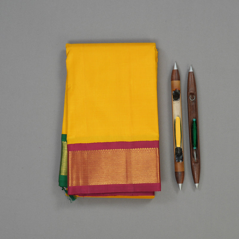 A vibrant and unique Yellow Korvai Contrast Kanjivaram Silk Saree, featuring a desirable Ganga Jamuna Border in Maroon & Green. This pure silk piece showcases the traditional dual-toned border technique.