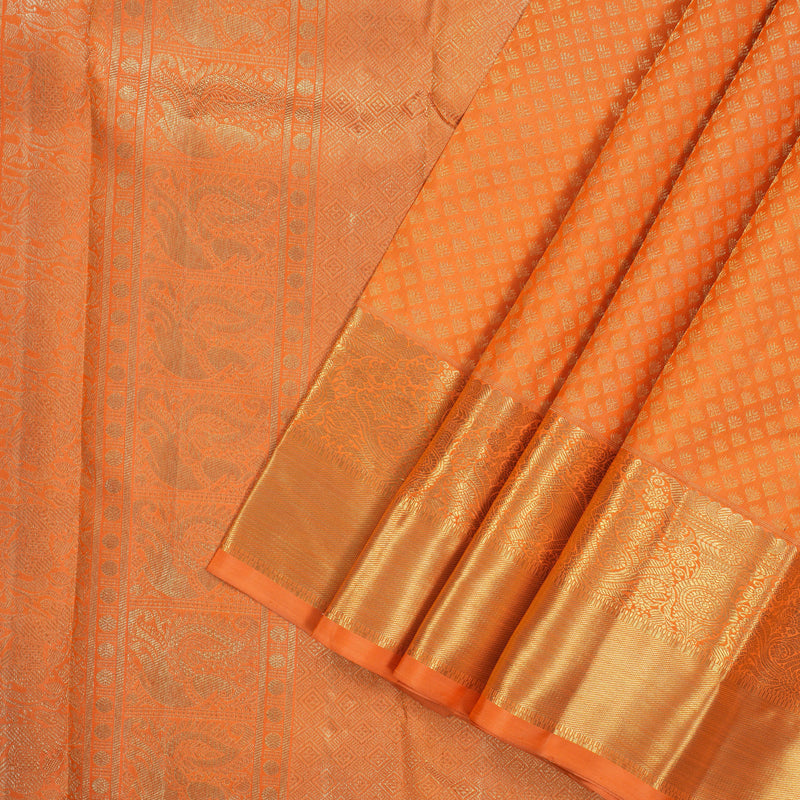 The body of the saree is a captivating Peach Orange, woven with a subtle, intricate checked pattern. This gives the fabric a rich texture and depth, making the color appear even more vibrant and luxurious. The surface shimmers with a gentle, metallic glow, characteristic of high-quality silk.