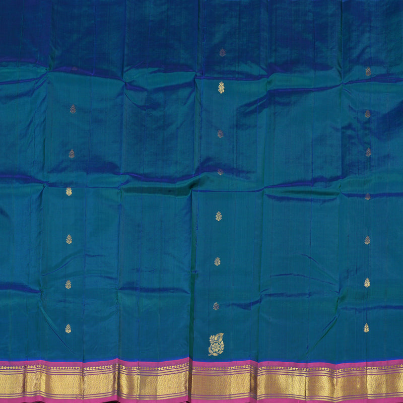 This exquisite pure One-sided border lightweight Kanjivaram silk saree features a mesmerising mayilkazhuthu body that captures the iconic, iridescent teal of a peacock’s neck. The deep, shimmering hue is strikingly framed by a vibrant magenta border and pallu, offering a bold and regal colour contrast that is exceptionally easy to carry at Rs. 8350.