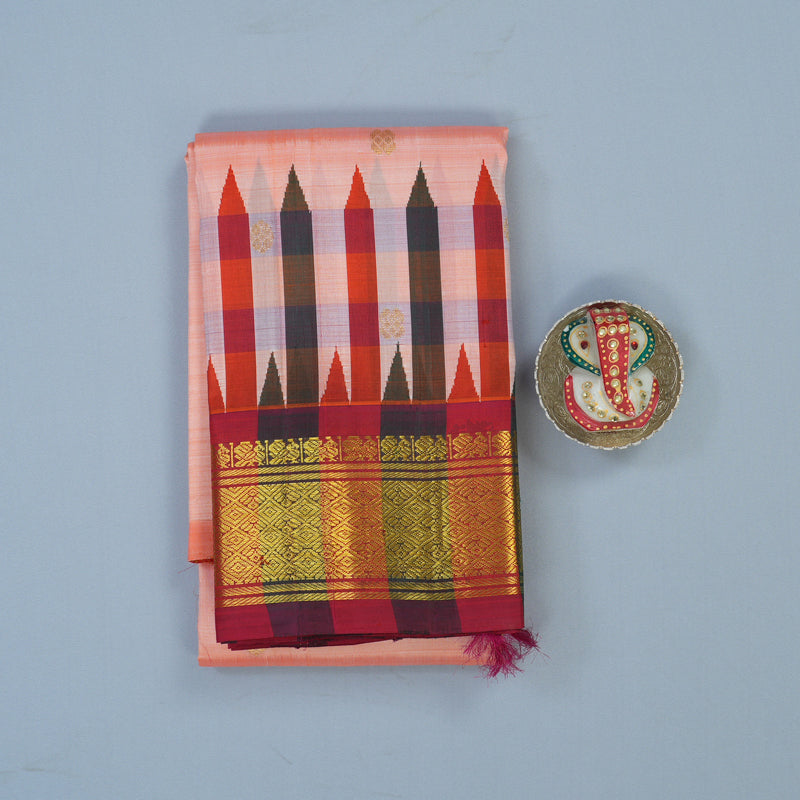 This Pure One-sided border, lightweight Kanjivaram silk saree features a soft and luminous peach body that radiates a subtle, feminine grace. The look is artistically elevated by a vibrant multicoloured border and maroon pallu, offering a sophisticated and rich contrast that remains exceptionally easy to carry at Rs. 11110.