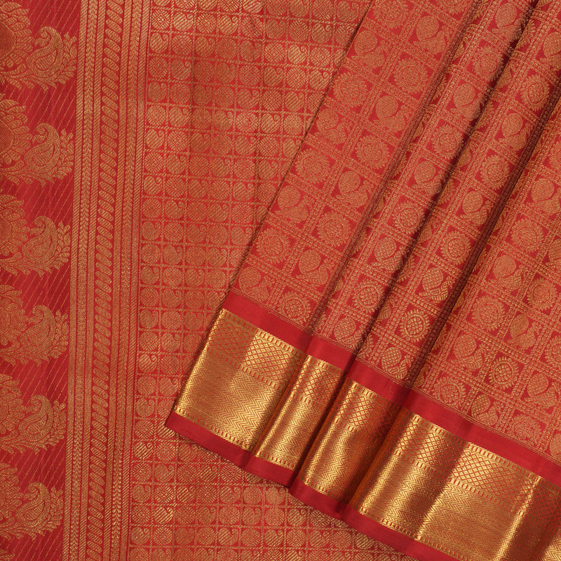 The pallu is a masterpiece in itself. It’s a wide expanse of rich red, horizontally segmented by bold, wide stripes of intricate gold zari work. Each stripe is a different, ornate pattern—from traditional coin motifs to floral lattices—creating a harmonious and elaborate design that will drape gracefully over the shoulder. The entire piece exudes a sense of timeless luxury and tradition.