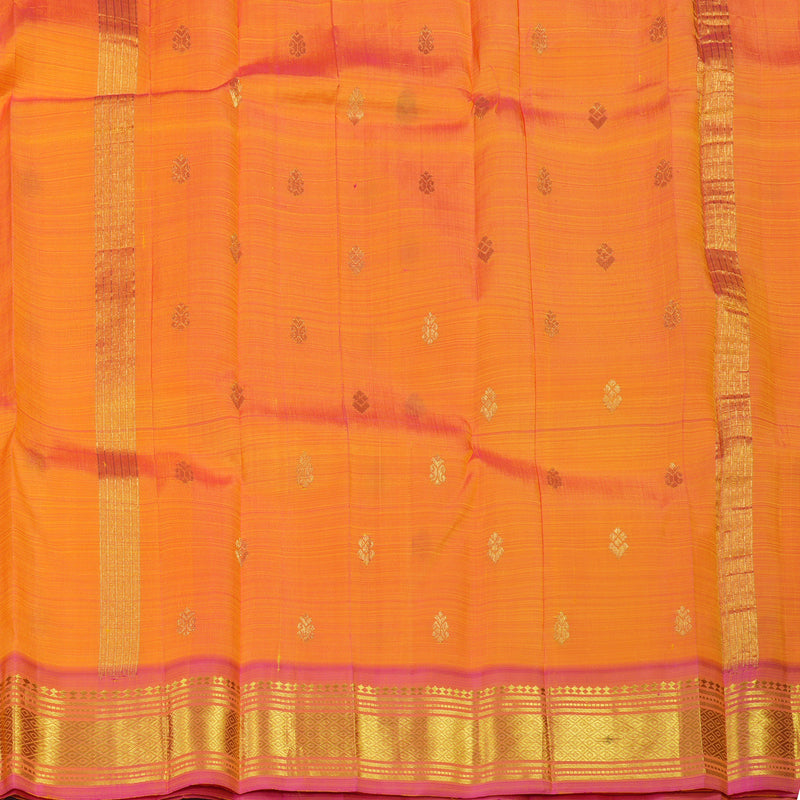 This charming Pure One-sided border lightweight Kanjivaram silk saree features a sunny yellow body with thread butta that adds a delicate, textured elegance to the drape. The ensemble is beautifully framed by a classic orangish-pink border and pallu, creating a quintessential and vibrant colour combination that is both traditional and easy to carry at Rs. 7250.