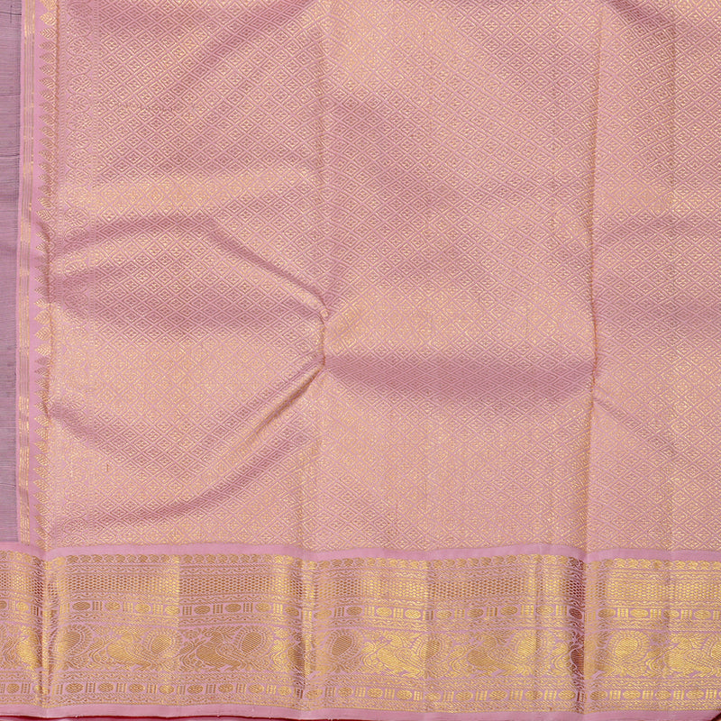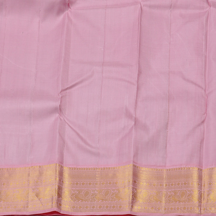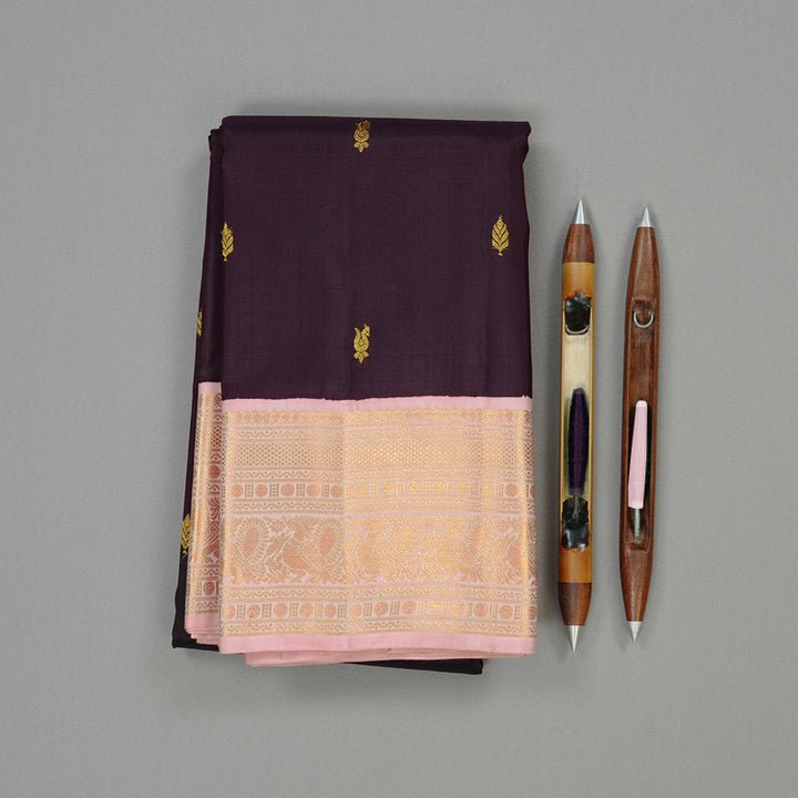This korvai contrast Kanjivaram silk saree features a unique pairing of dark brown with a soft baby pink border. Adorned with peacock and rudraksha motifs on the border and small buttas across the body, it’s a celebration of sacred symbolism. A graceful drape for religious and festive occasions. Combines divine motifs with graceful hues.