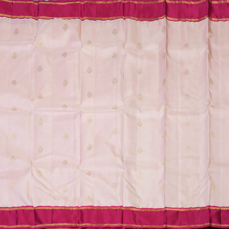 This Handloom Kanjivaram features a delicate baby pink body adorned with graceful floral motifs, offering a soft and romantic aesthetic. The design is anchored by a traditional rettapet korvai border, which provides a expert artisanal weaving.
