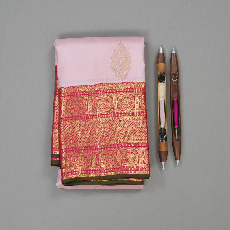 Experience the grace in this enchanting baby pink Handloom Kanjivaram silk saree, featuring delicate thilagam motifs beautifully scattered across the body. The saree is framed by a grand, detailed border and uniquely accented with a manthalir green selvedge, adding a fresh and traditional touch to the edges.