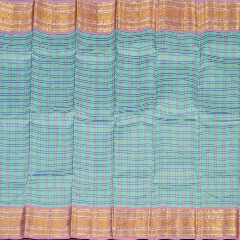 Make a stunning statement in this bright teal Handloom Kanjivaram silk saree, featuring a unique body woven with checks using thread as jari for a sophisticated shimmer. This exquisite piece utilises the korvai contrast technique to seamlessly join the teal body to a magnificent varisapet border, which is intricately detailed with peacock, elephant, and many traditional elements.