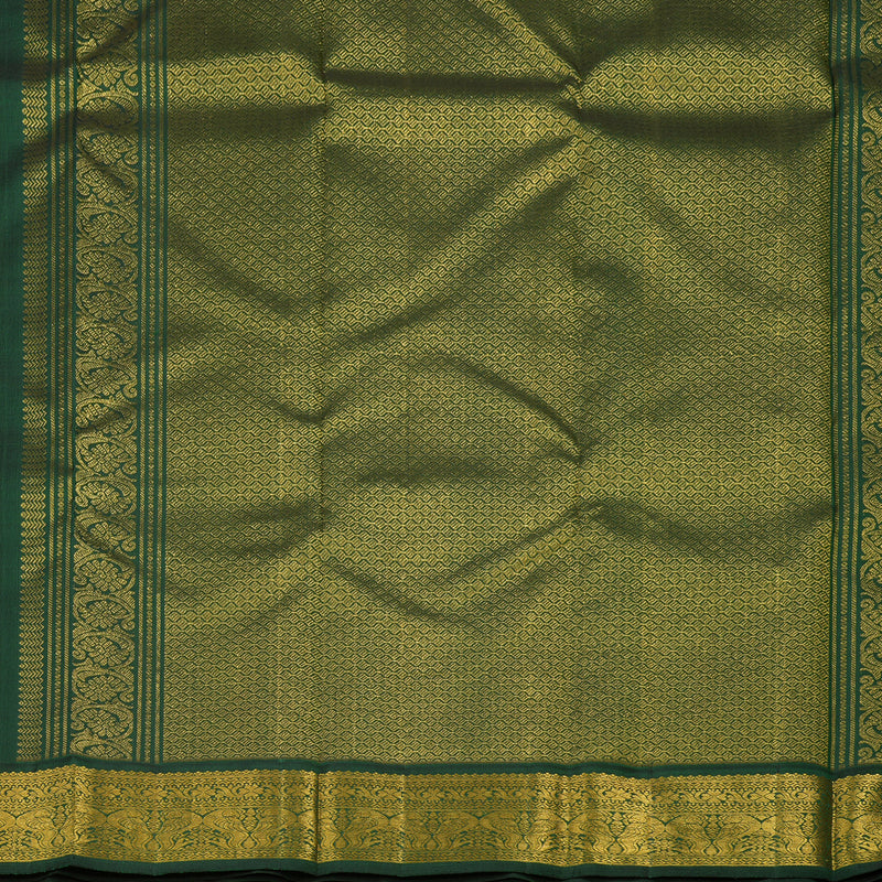 The saree transitions into a stunning karum pachai (dark green) blouse and pallu, showcasing a richly woven pallu that serves as a masterpiece of handloom artistry. Priced at Rs.19,690, this timeless colour combination is perfect for weddings and festive celebrations alike.