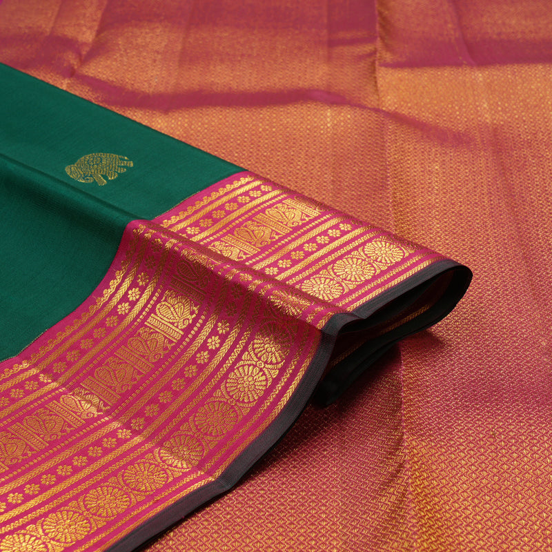 This Handloom Kanjivaram features a majestic emerald green body adorned with traditional elephant motifs. Masterfully crafted using the korvai technique, it ensures a sharp, seamless transition between the vibrant green silk and its heritage-rich borders.